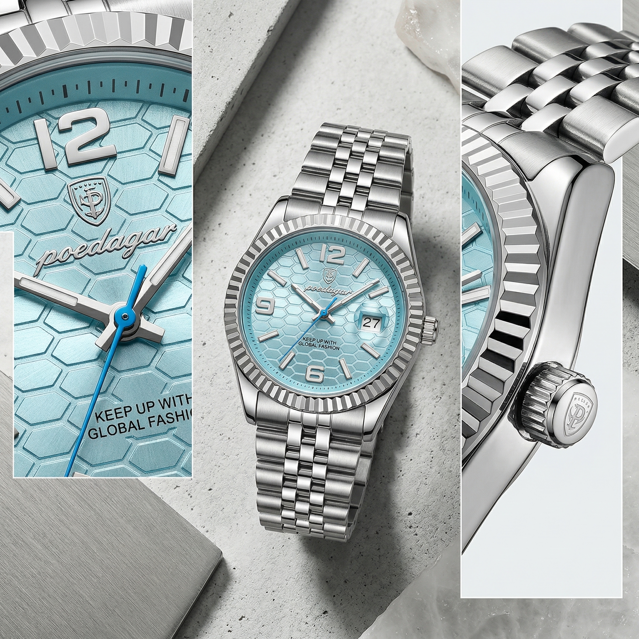 Experience Timeless Sophistication. The POEDAGAR 839 is more than just a watch; it’s a statement of class. Featuring a stunning light blue dial with a unique honeycomb texture and a classic fluted bezel, this timepiece captures the essence of luxury Swiss design. Whether you’re at a wedding, a business meeting, or a casual dinner, the 839 adds an undeniable touch of elegance to your wrist.